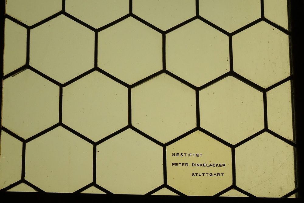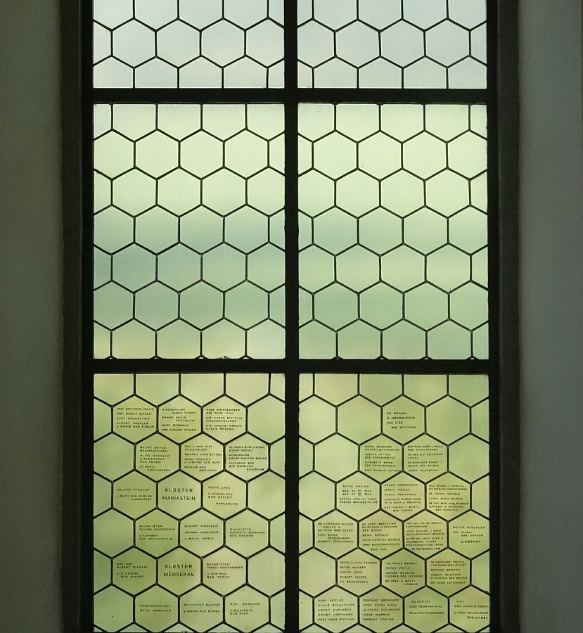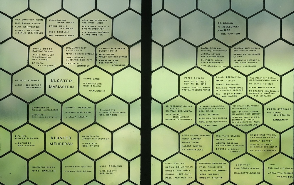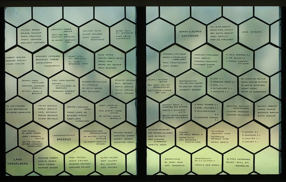 Klarglasfenster mit äußerst zahlreichen Stifternamen. Hier stellen die Fenster den bemerkenswerten Sonderfall dar, dass weder dekorative noch