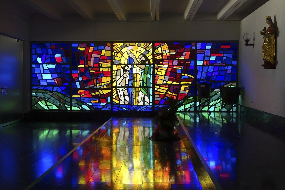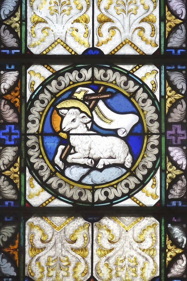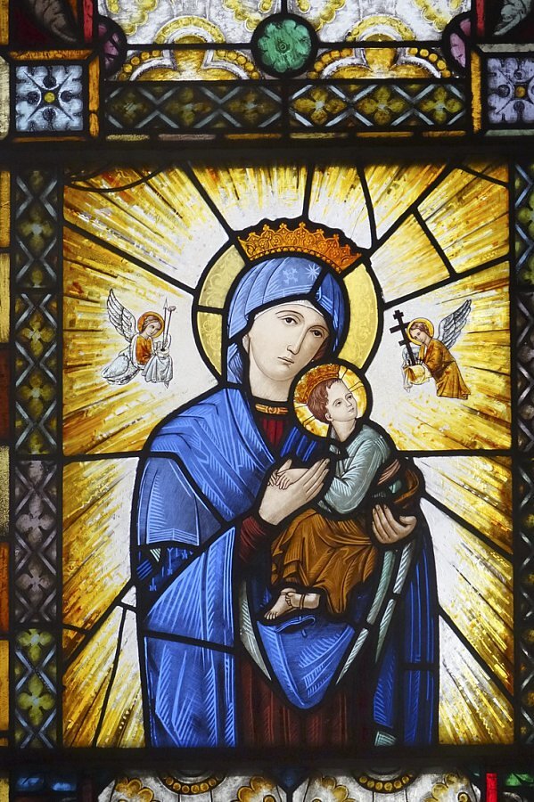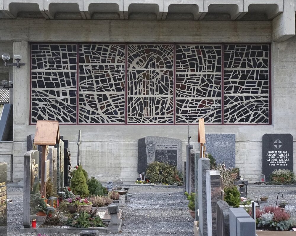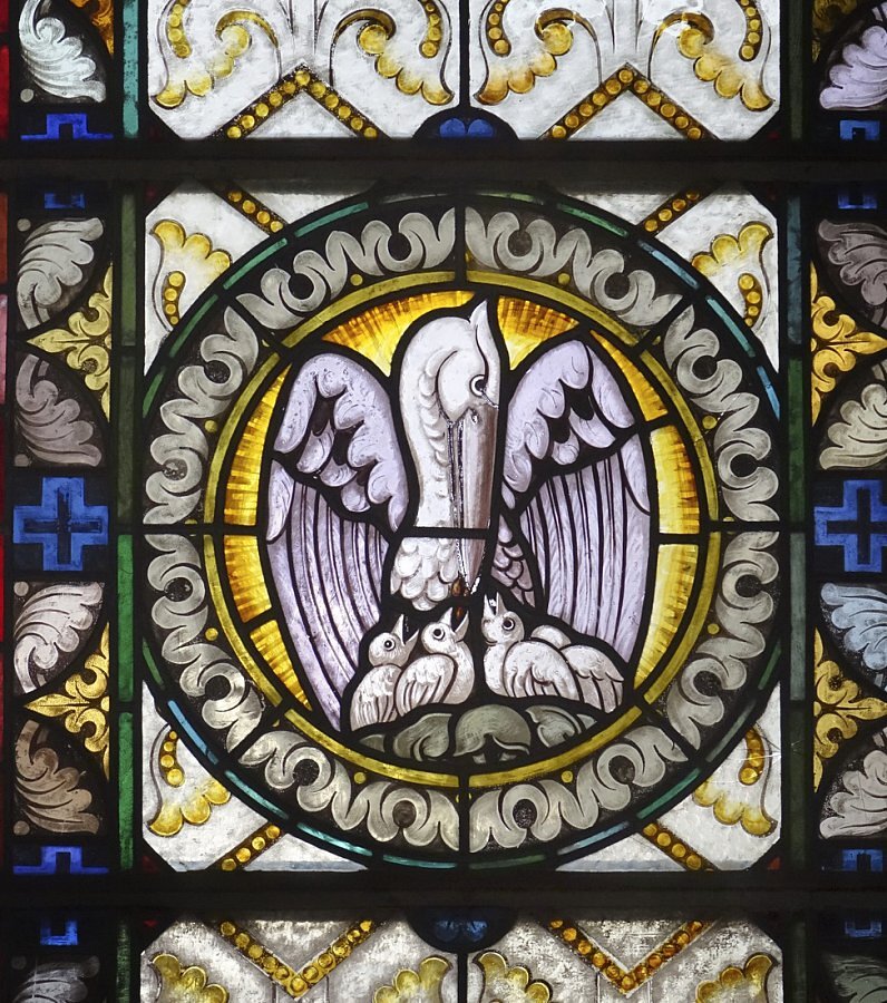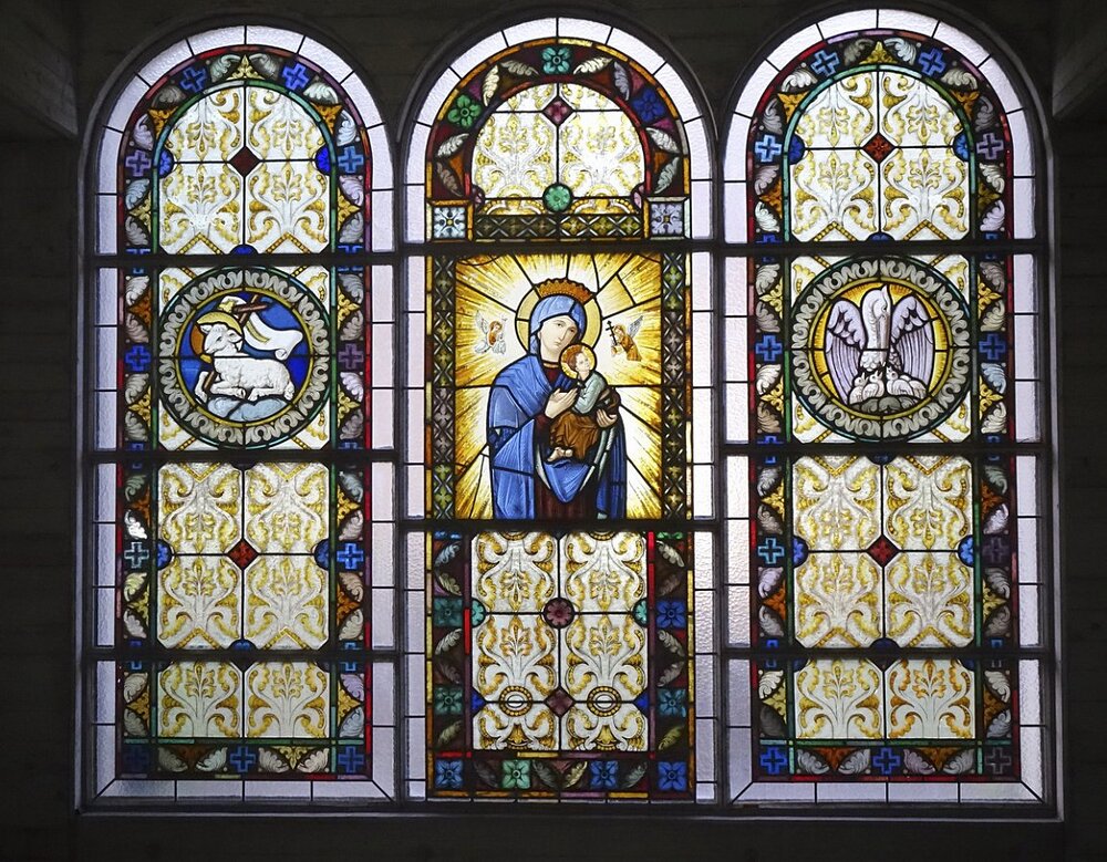 Aufbahrungshalle: Glasgemälde Maria mit Kind, Lamm Gottes und Pelikan aus der alten Pfarrkirche, 1879