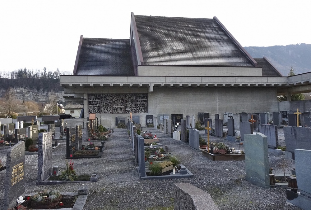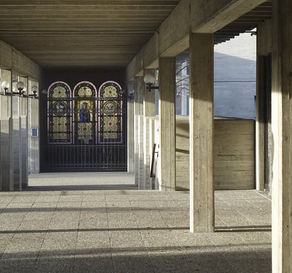 1970-72 Plan von Guntram Mätzler, 1976 Abbruch der alten Kirche, 1977 geweiht
