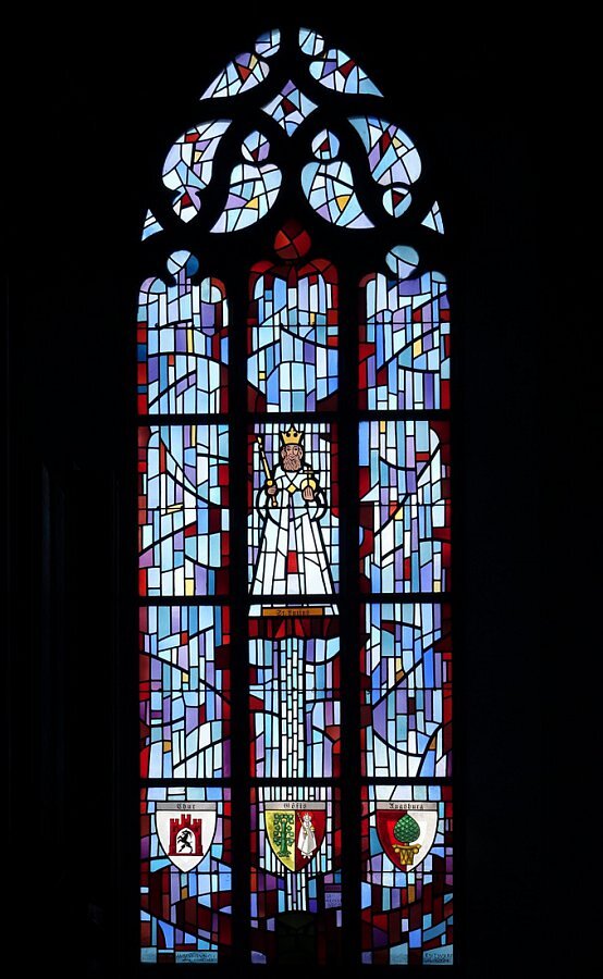 Chorsüdwand: hl. Luzius und Wappen von Chur, Göfis und Augsburg, bez. "Entwurf Wider, Ausführung Loire Chartres 1974"