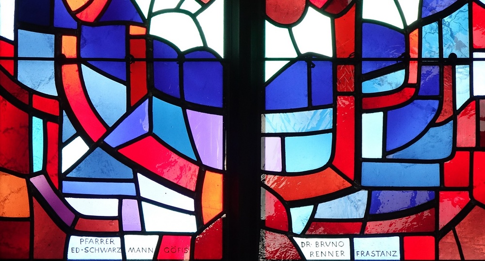 Göfis, Pfarrkirche Hl. Luzius, Fenster Albert Wider, Widnau 1974, Ausführung Loire Chartres, Stifter Pfarrer Ed. Schwarzmann Göfis Dr. Bruno Renner Frastanz
