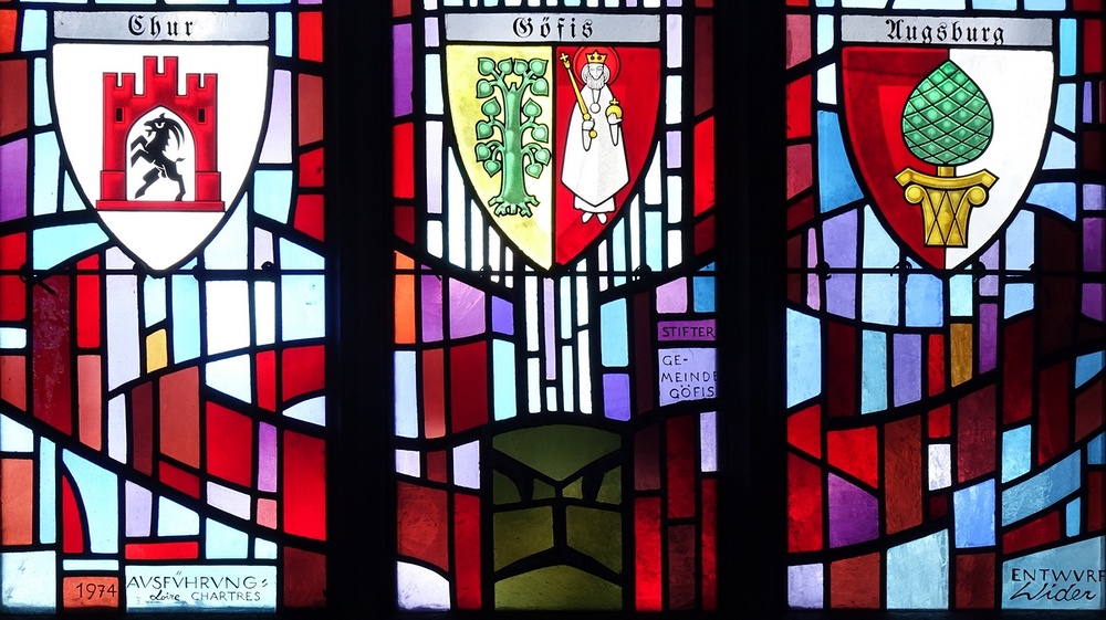 Göfis, Pfarrkirche Hl. Luzius, Fenster mit Wappen von Chur Göfis Augsburg, Albert Wider, Widnau 1974