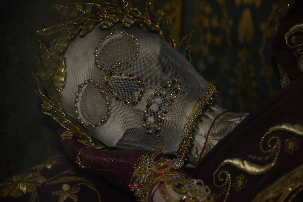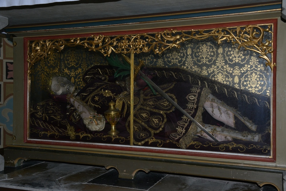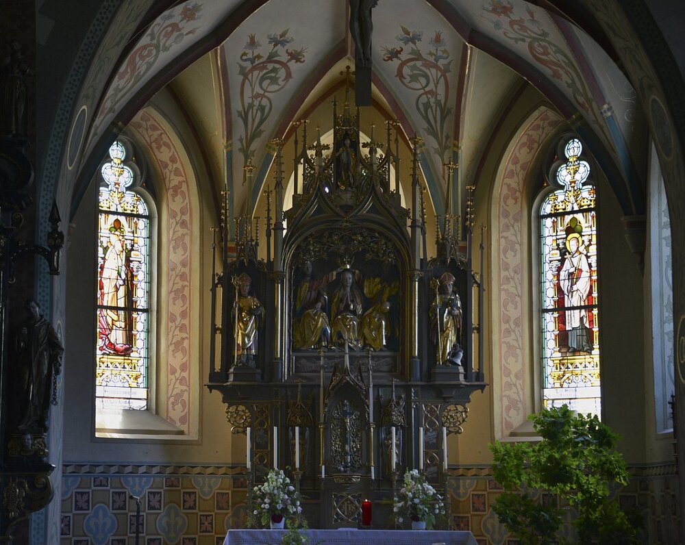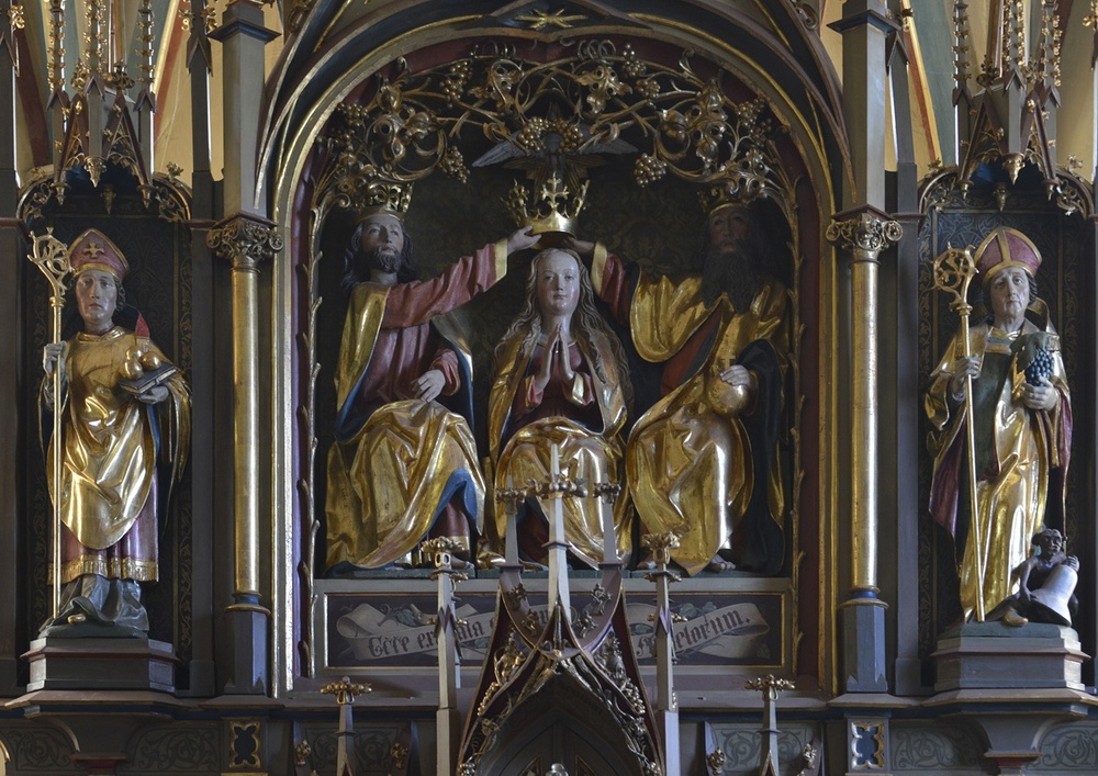 Hochaltar spätgotische Krönung Mariens mit hl. Nikolaus und hl. Theodul um 1500, Schrein mit Reliquie, Skelett des hl. Modestus, 1820 aus Rom