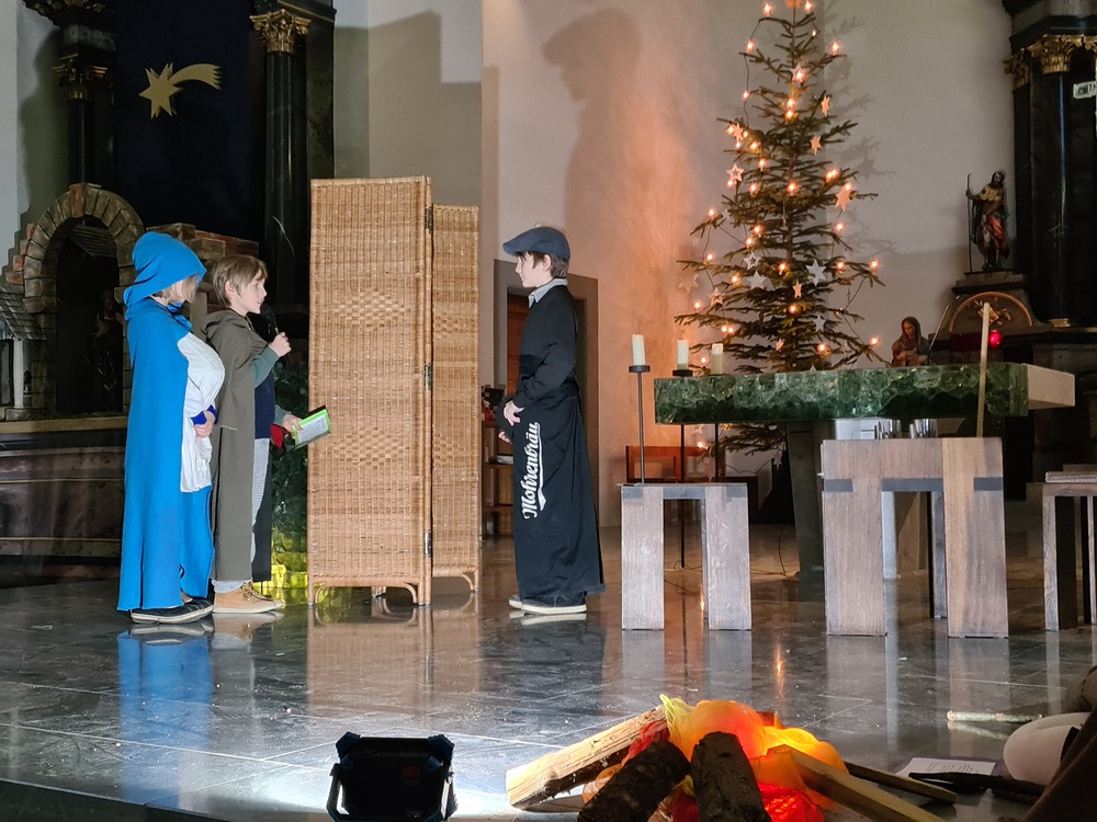 24. Dezember 2025: Im Oberdorf spielten Kinder die Geschichte von Jesus Geburt aus der Perspektive von Samuel, dem Wirten und seinem Diener Jonathan.